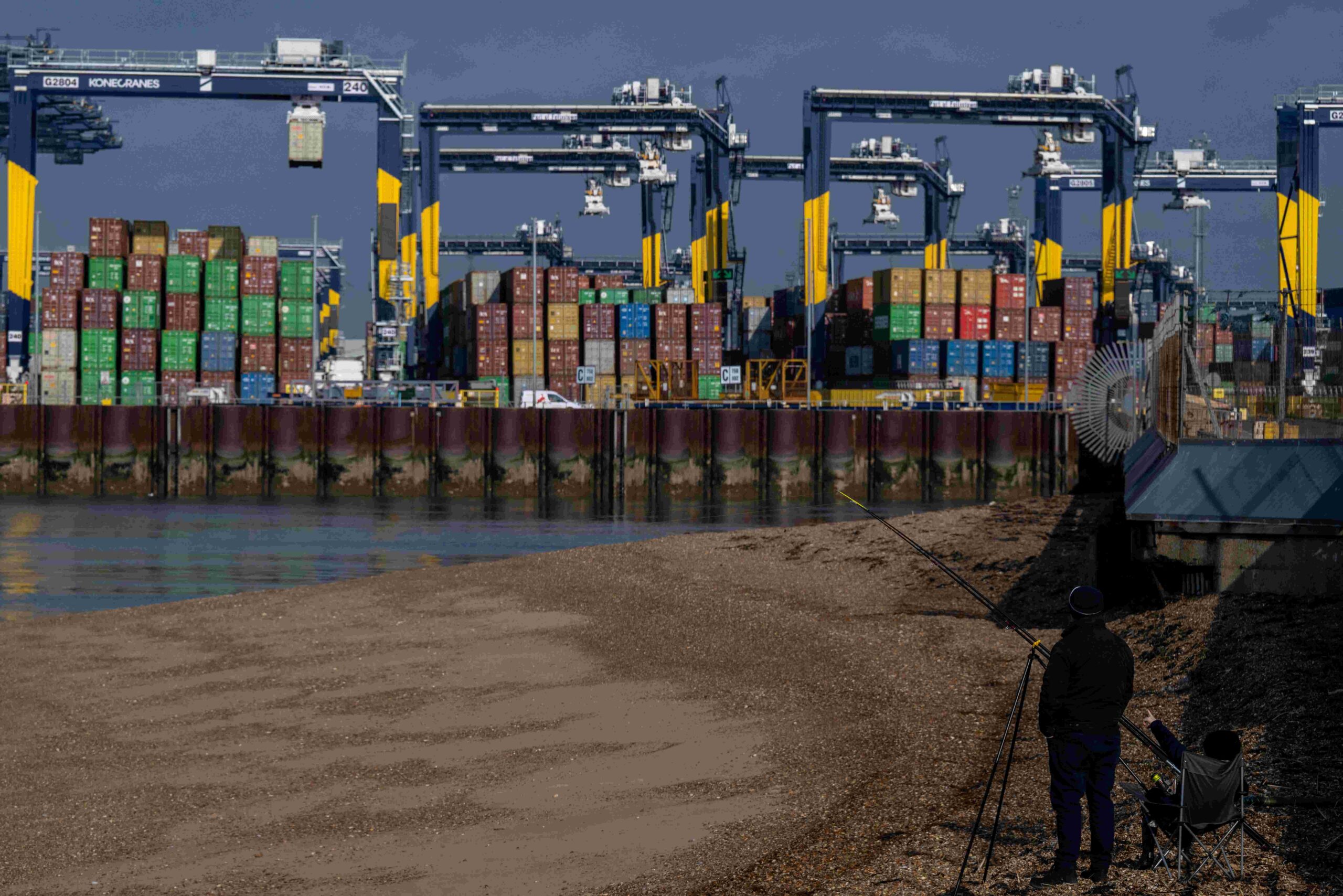 A man, while fishing, points towards shipping containers at the Port of Felixstowe in Felixstowe, Britain, February 17, 2025. REUTERS/Chris J. Ratcliffe/File Photo