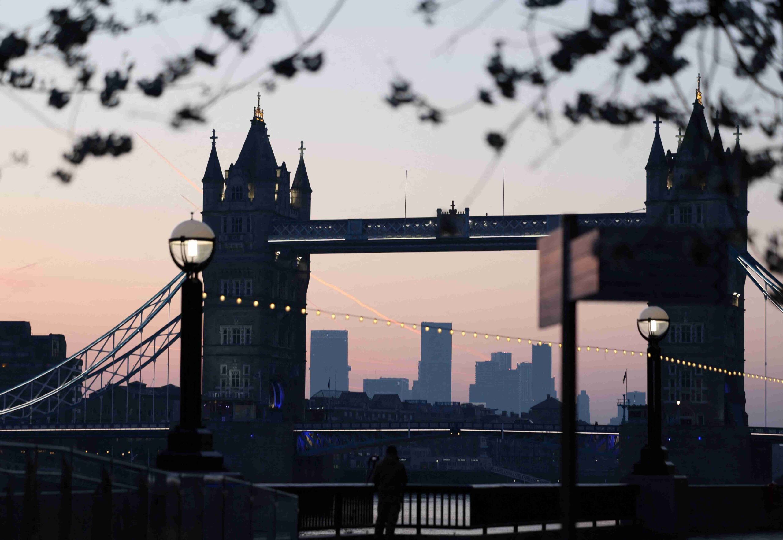 FILE PHOTO: A man takes photos as the sun rises behind Tower Bridge and the Canary Wharf financial district, in London, Britain, April 11, 2025. REUTERS/Isabel Infantes/ File Photo
