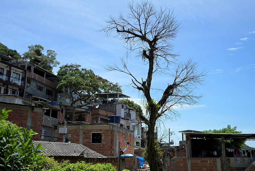 A dried tree stands at the Babilonia favela during a hot summer day, as a study measures how extreme heat linked to climate change affects residents of low-income communities, in Rio de Janeiro, Brazil, January 16, 2026. REUTERS/Tita Barros