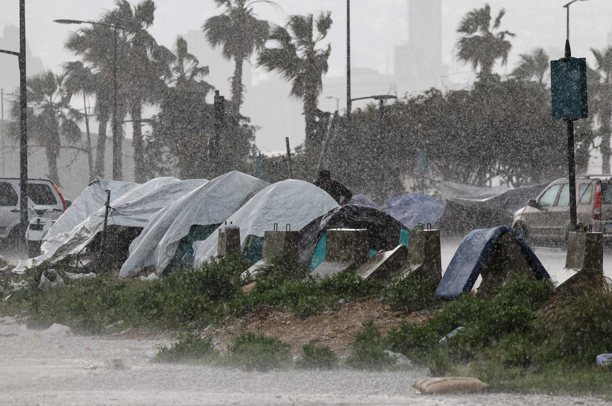 Rain falls over tents used by displaced people on a street along the corniche overlooking the sea, following an escalation between Hezbollah and Israel, amid the U.S.-Israeli conflict with Iran, in Beirut, Lebanon, March 15, 2026. REUTERS/Amr Abdallah Dalsh