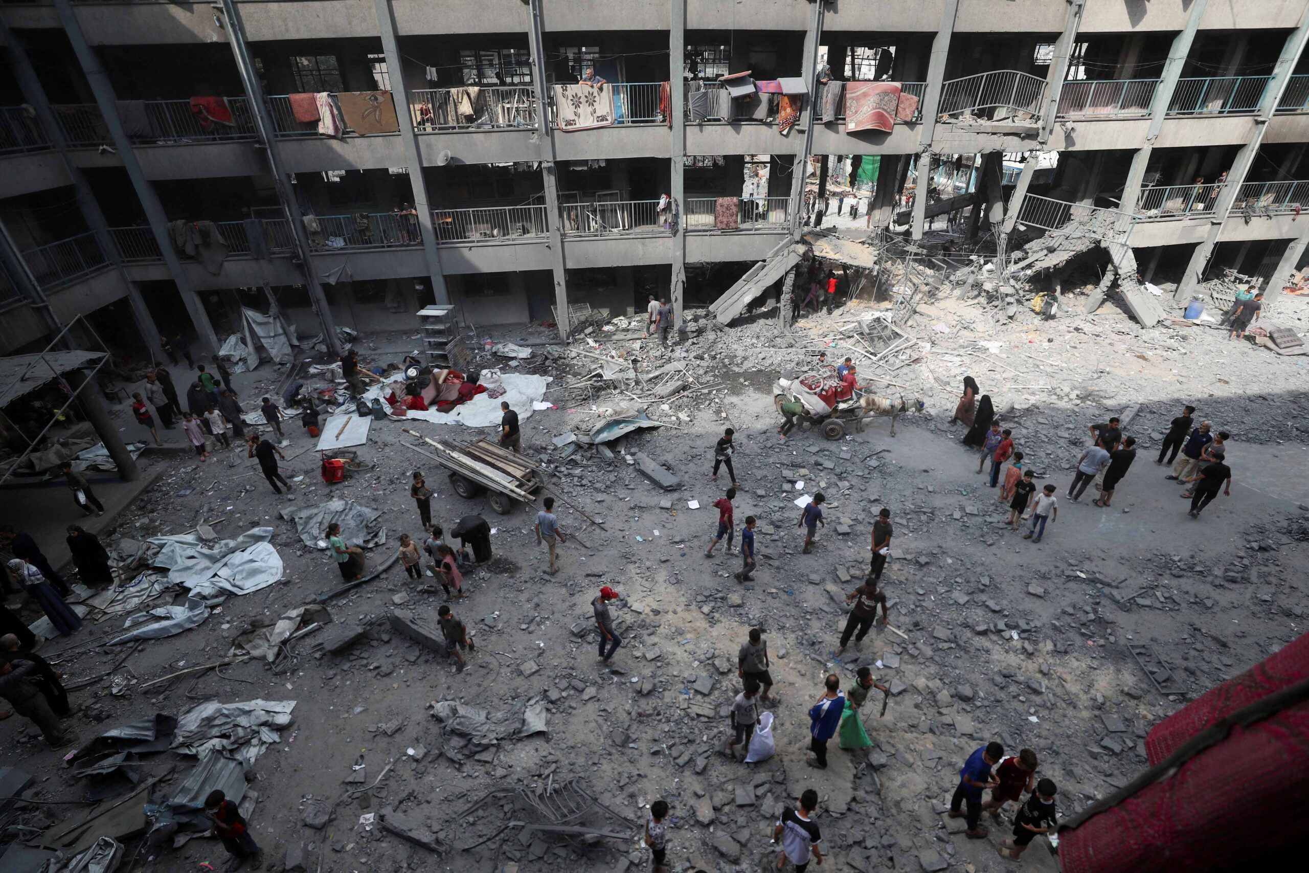 “Look at us, we are not just numbers and not just pictures. Every day martyrs like this,” said displaced woman Amani Swalha, standing in the rubble of a Gaza city school hit in a strike. “It is our right to live, and to live with dignity, not like this in humiliation.”