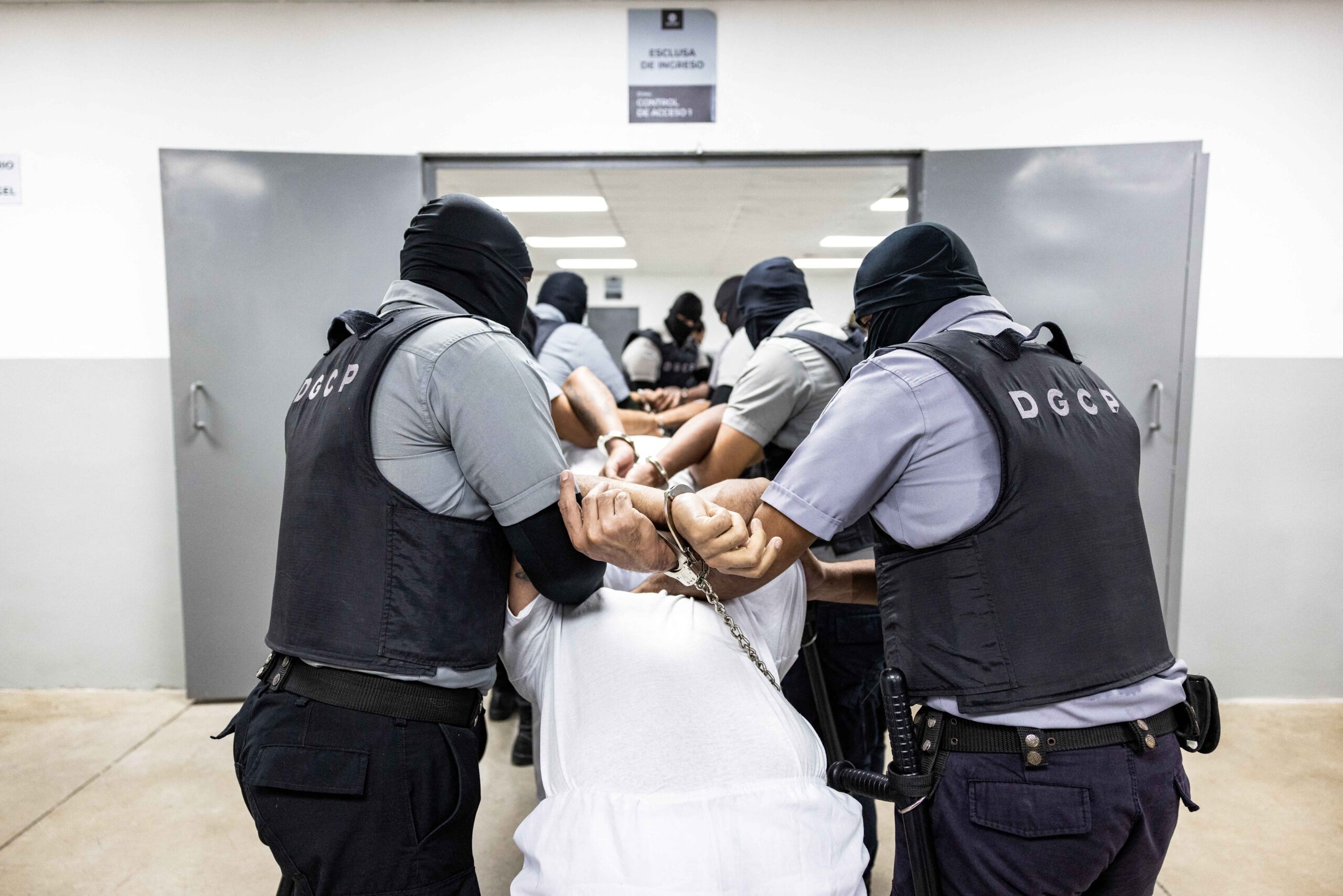 FILE PHOTO: Salvadoran prison guards escort alleged members of the Venezuelan gang Tren de Aragua and the MS-13 gang recently deported by the U.S. government to be imprisoned in the Terrorism Confinement Center (CECOT) prison, in Tecoluca, El Salvador April 12, 2025. Secretaria de Prensa de la Presidencia/Handout via REUTERS/File Photo