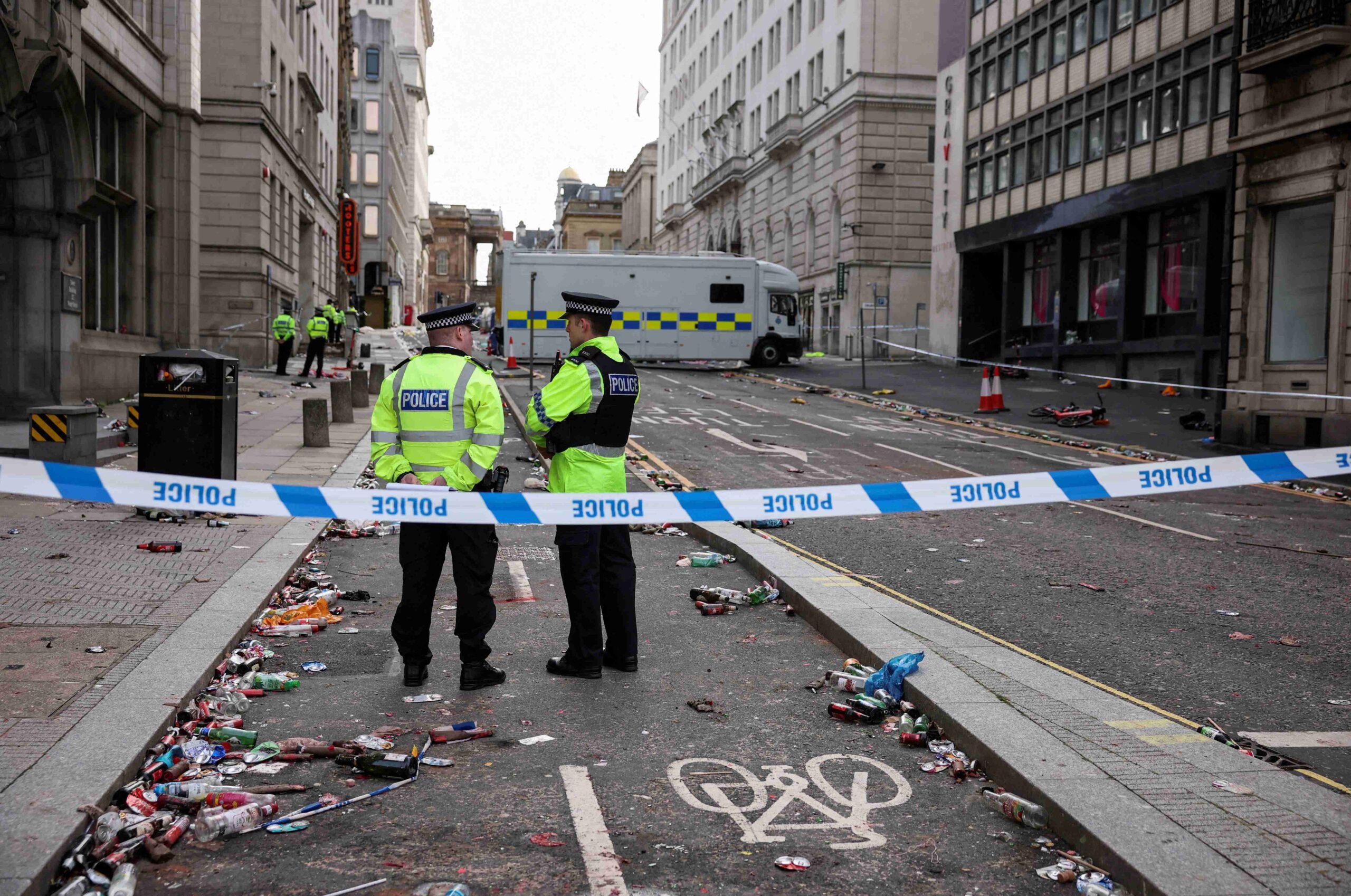 Police officers work at the scene after an incident where a car plowed into a crowd of Liverpool fans during a parade celebrating their side's Premier League soccer title, in central Liverpool, Britain, May 27, 2025. REUTERS/Phil Noble