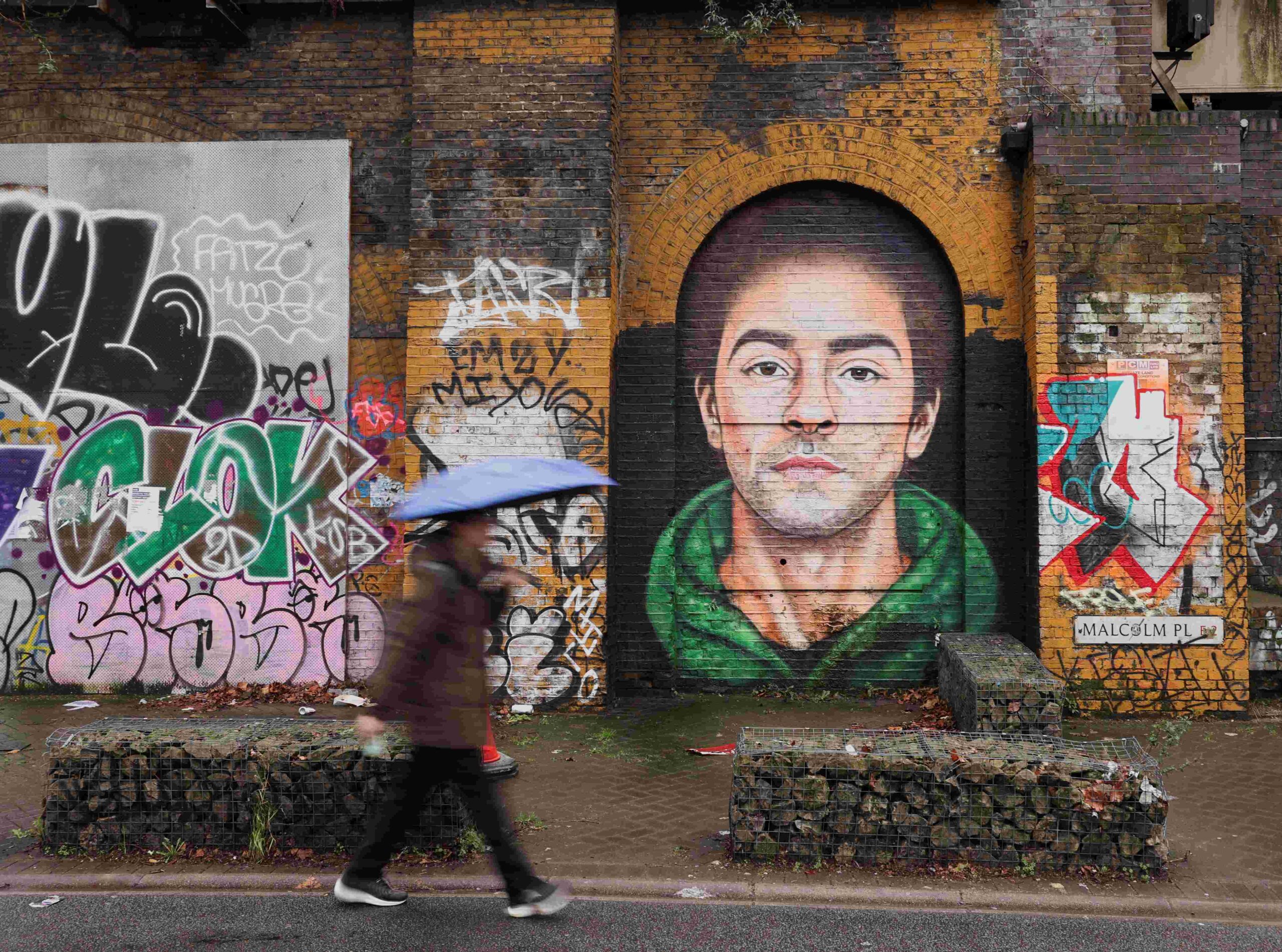 The large portrait of Mangione was spotted under a railway bridge in Bethnal Green, east London, depicting the 26-year-old in a green hoodie with his hair framed by an arch on the brick wall.