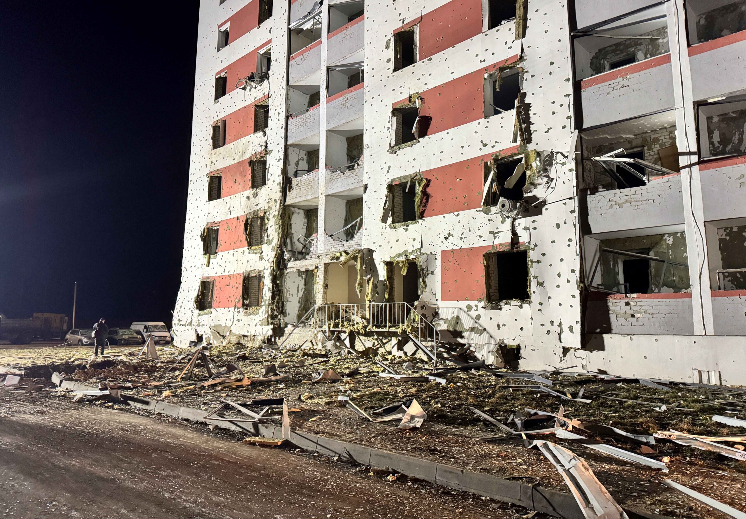 A view shows an apartment building hit by a Russian drone strike, amid Russia's attack on Ukraine, in Kharkiv, Ukraine March 26, 2025. REUTERS/Stringer