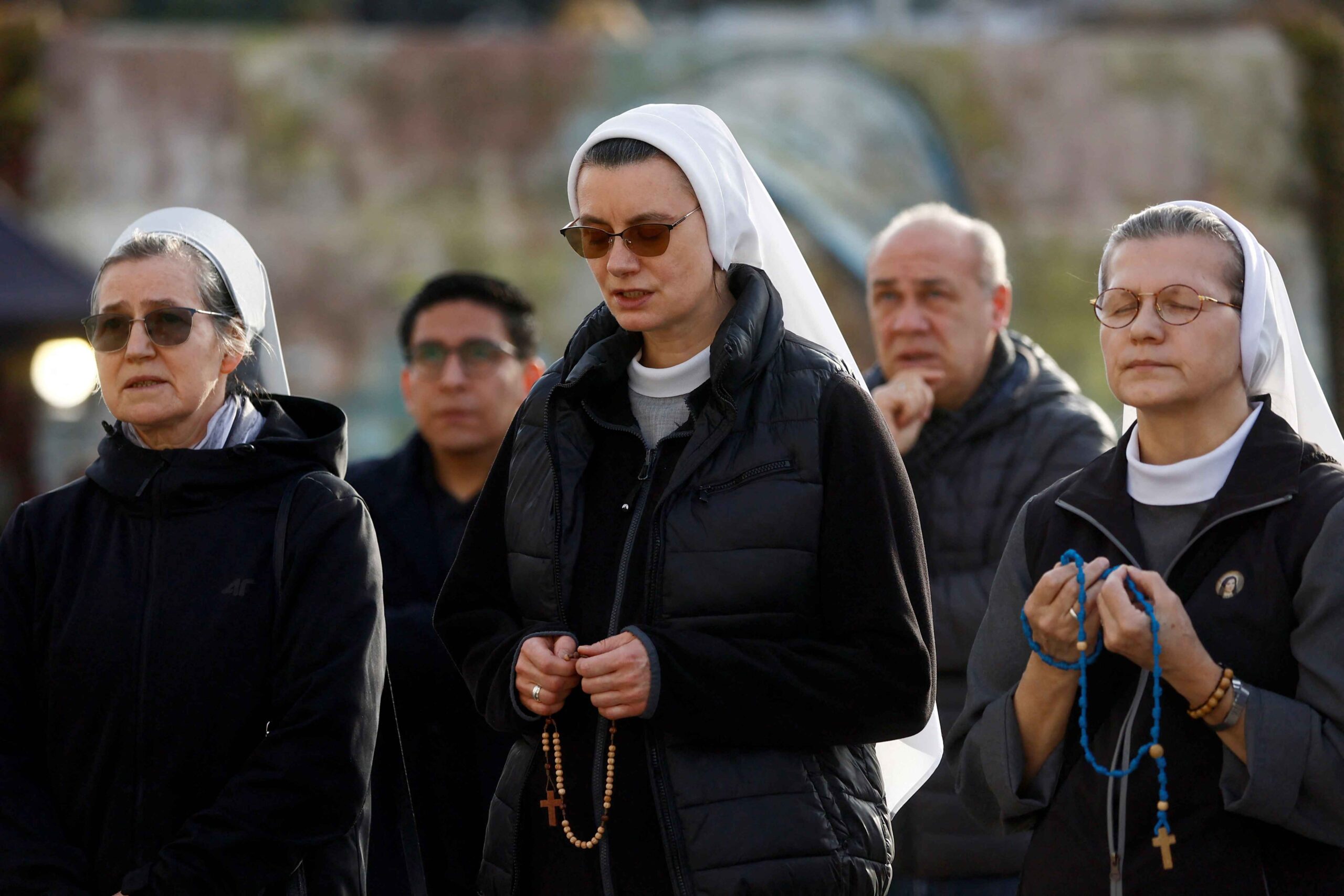 Nuns pray outside the Gemelli Hospital where Pope Francis is admitted for treatment, in Rome, Italy, February 23, 2025. REUTERS/Vincenzo Livieri
