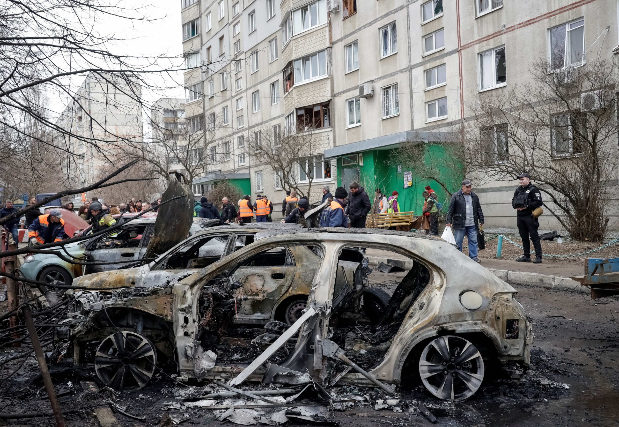 Destroyed vehicles at the site of a Russian drone strike, amid Russia's attack on Ukraine, in Kharkiv, Ukraine, March 25, 2026. REUTERS/Sofiia Gatilova