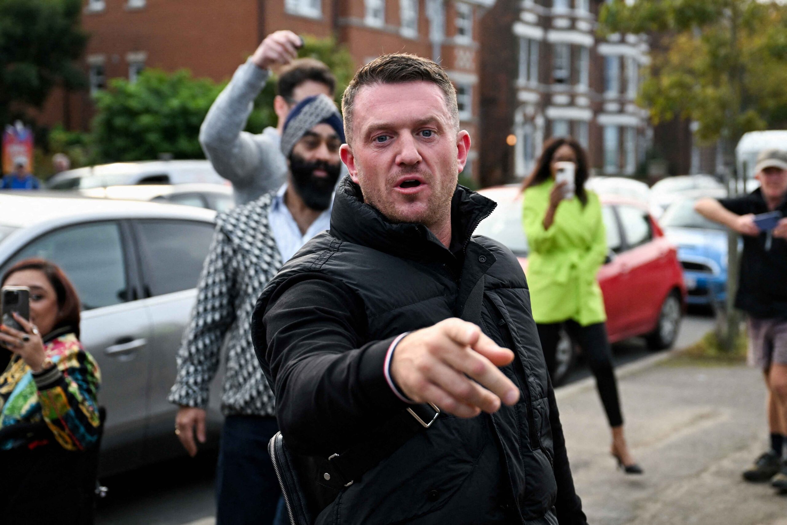 FILE PHOTO: Anti-immigration activist Stephen Yaxley-Lennon, known as Tommy Robinson, gestures before arriving at Folkestone Police Station in Folkestone, Britain, October 25, 2024. REUTERS/Chris J Ratcliffe/File Photo