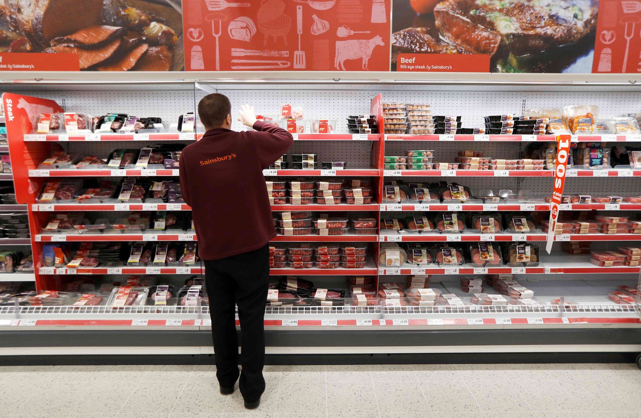 FILE PHOTO: A Sainsbury's worker stacks a meat shelf in a store in Redhill, Britain, March 27, 2018. REUTERS/Peter Nicholls/File Photo