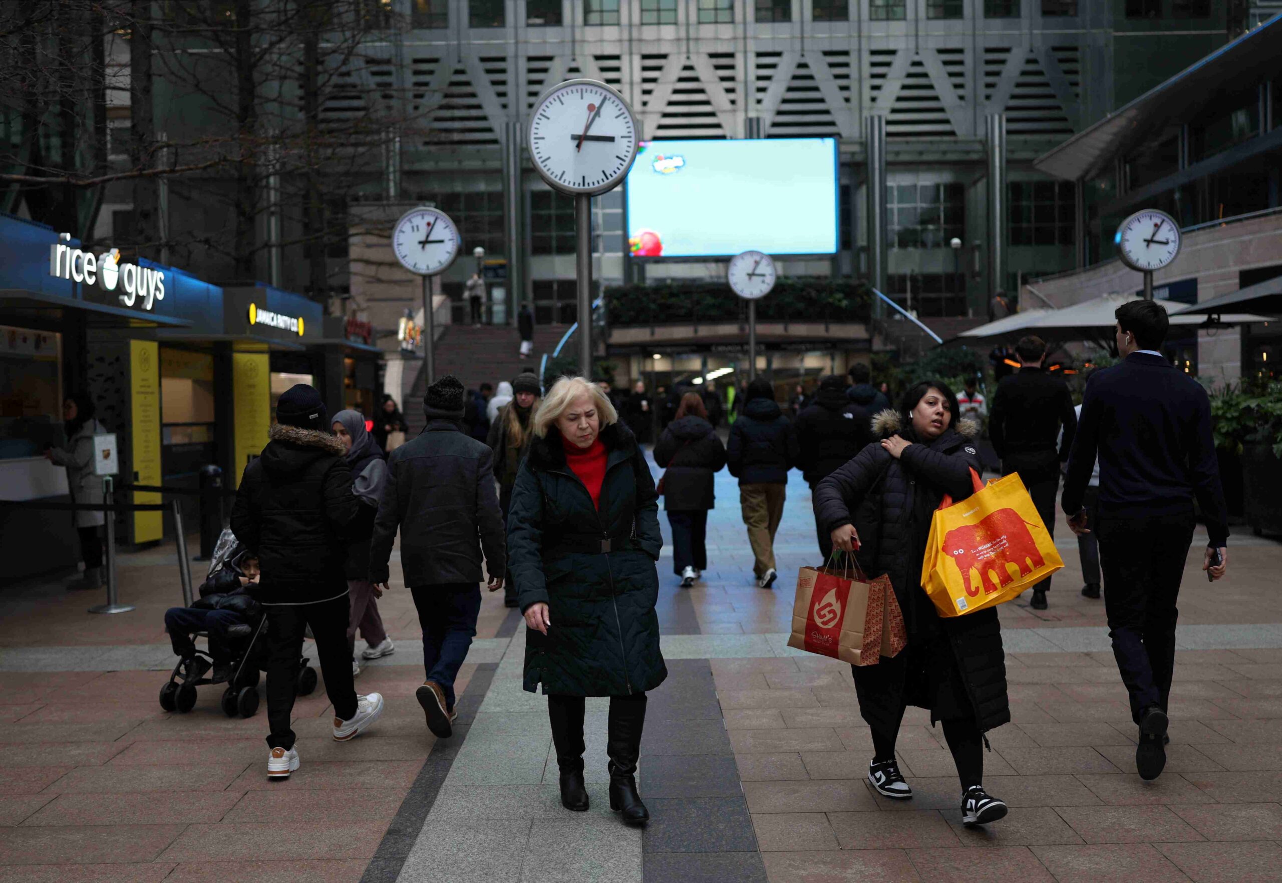 FILE PHOTO: People walk across Reuters Plaza in Canary Wharf financial district, London, Britain, February 13, 2025. REUTERS/Isabel Infantes/File Photo