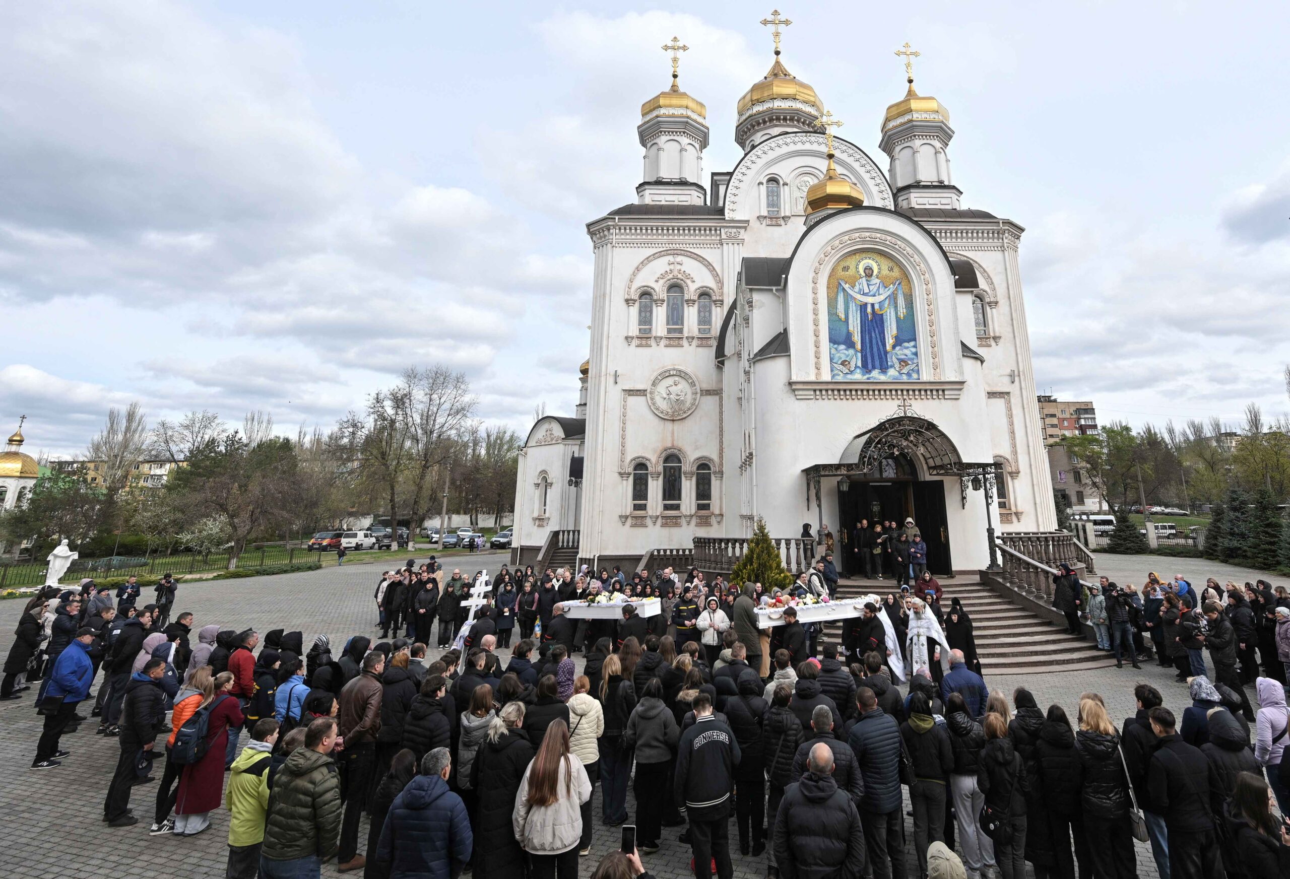 Down the road, mourners flocked to a double funeral for 15-year-old Danylo Nikitskyi and Alina Kutsenko, who were later buried side by side in matching white coffins.