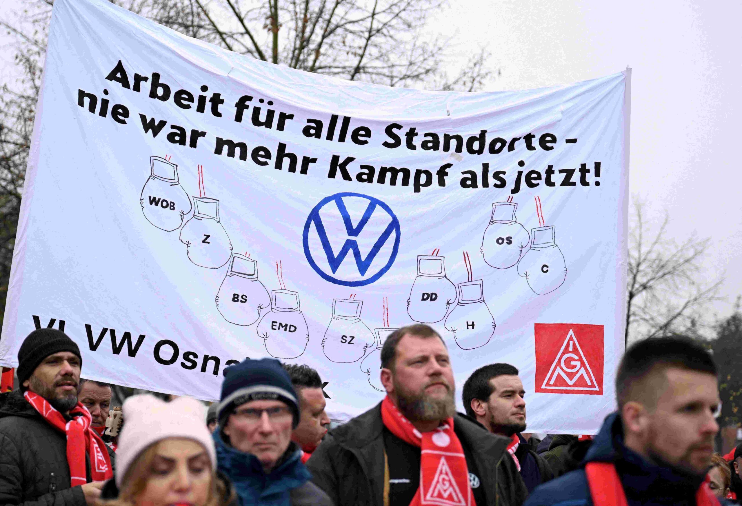 FILE PHOTO: Employees of Volkswagen AG march for higher wages during a 'warning strike' of Germany's IG Metall metalworkers' union, in Osnabrueck, Germany, November 6, 2024. The placard reads, “Jobs for all VW sites - there has never been more fight than now”. REUTERS/Teresa Kroeger/File Photo