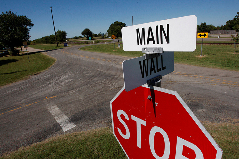 FILE PHOTO: A sign marks the intersection of Main Street and Wall Street in Windom, Texas, October 8, 2008. REUTERS/Jessica Rinaldi/File Photo
